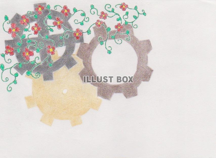 線は水性ペンの細いので描いて、色鉛筆で塗った花と歯車のちょっと絵。花の部分は以前に投稿した「青い花達」の下絵を位置を変えて使っています。歯車の部分は、縁を黒ペンにしてしまうと、良くない気がしたので描いてないです。