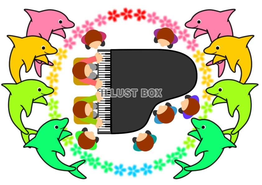 桜とピアノ、演奏する子供たちのイラストです。