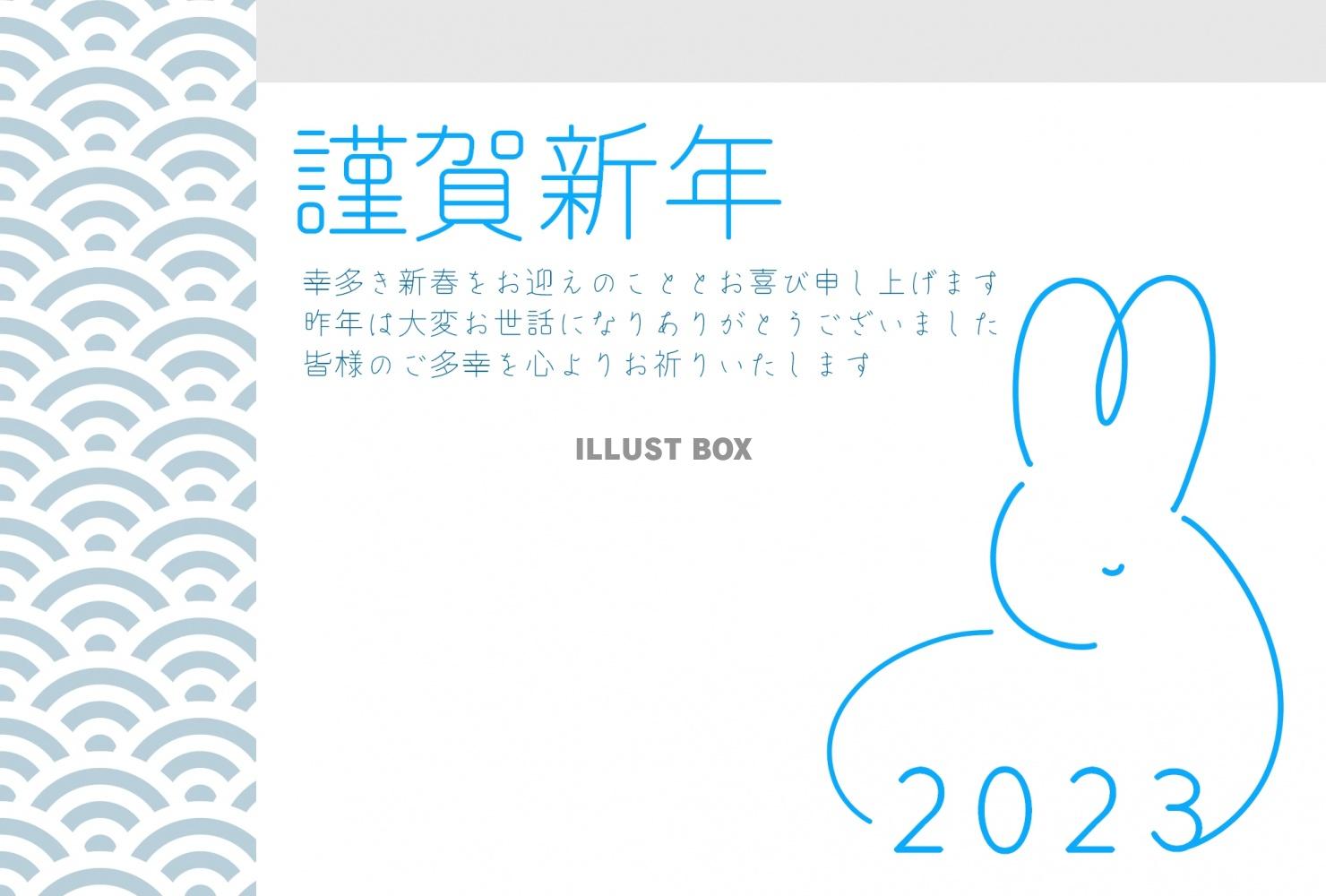 2023年の干支ウサギの青いシンプルな年賀状、挨拶文付き 横...