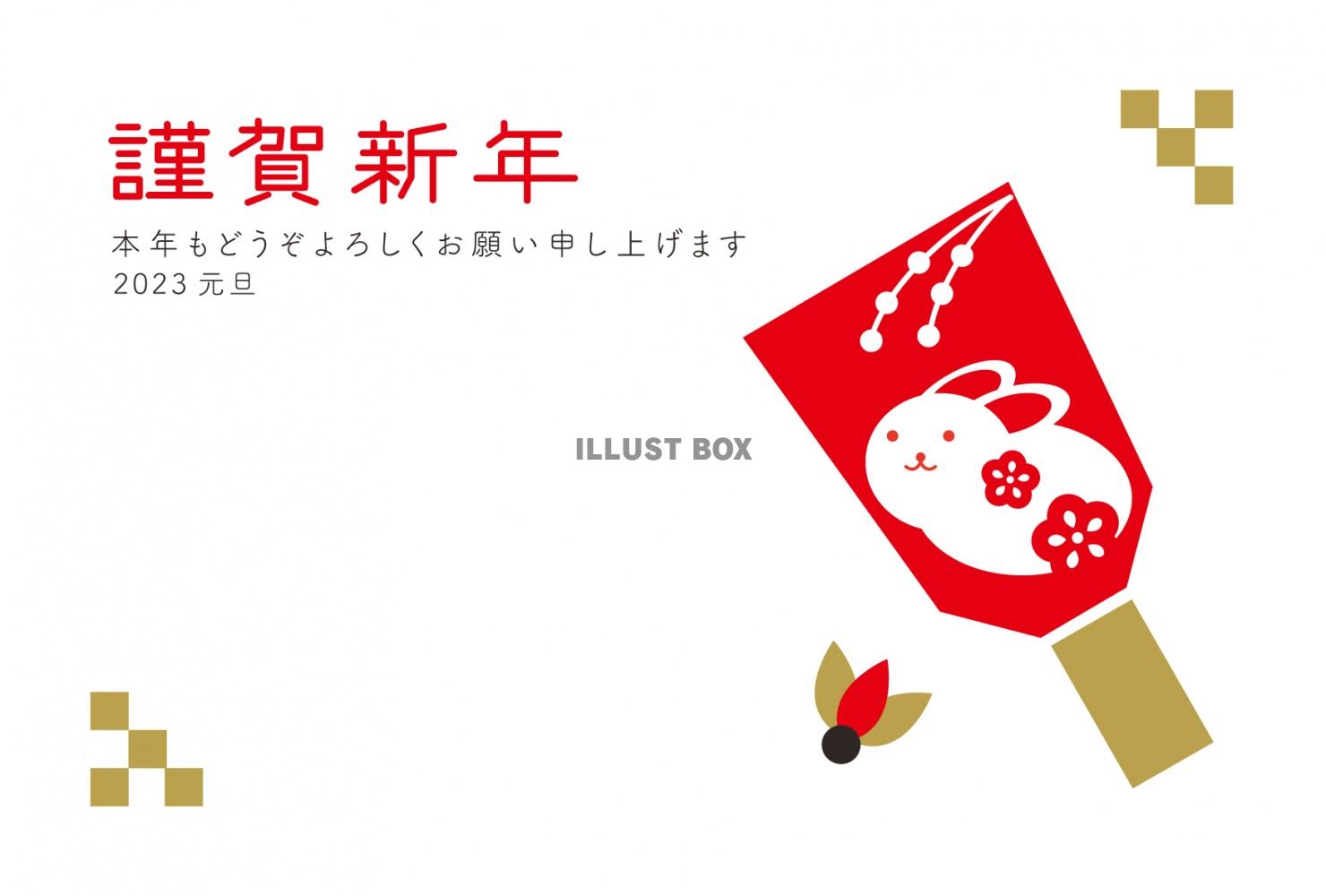 2023年卯年のうさぎのイラストの入った羽子板のある年賀状です。