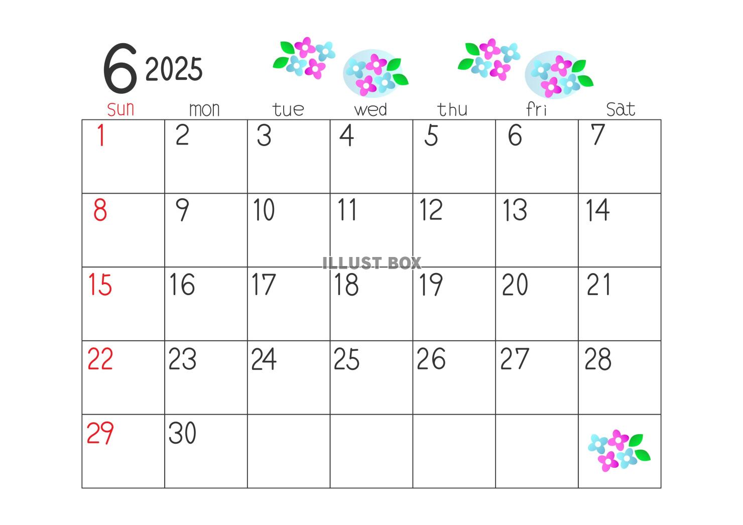 2025年6月の横型のカレンダー素材です。ご覧いただきありがとうございます。梅雨のイメージのあじさいの花のイラスト付きです。シンプルで記入スペースが広い使いやすい素材です。ご自宅や職場でのスケジュール管理などにご利用いただければと思います。