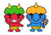 - 節分に使える恵方巻きと赤鬼とお多福と福豆と鰯柊のイラストの和風手描きの筆で描いたイラ...