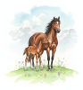 水彩画の力強いタッチで描かれた、草原の丘の上に立つ栗毛の親子の馬のイラストです。青空と緑の背景が爽やかで、優しく寄り添う姿は家族の絆や生命の温かさを感じさせます。午年の年賀状素材として最適であり、育児、子育て、生命保険、カレンダー、書籍の挿絵など、愛情や安心感