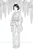 もみじの木の下で和服の女性が読書する秋の線画イラスト(塗り絵...