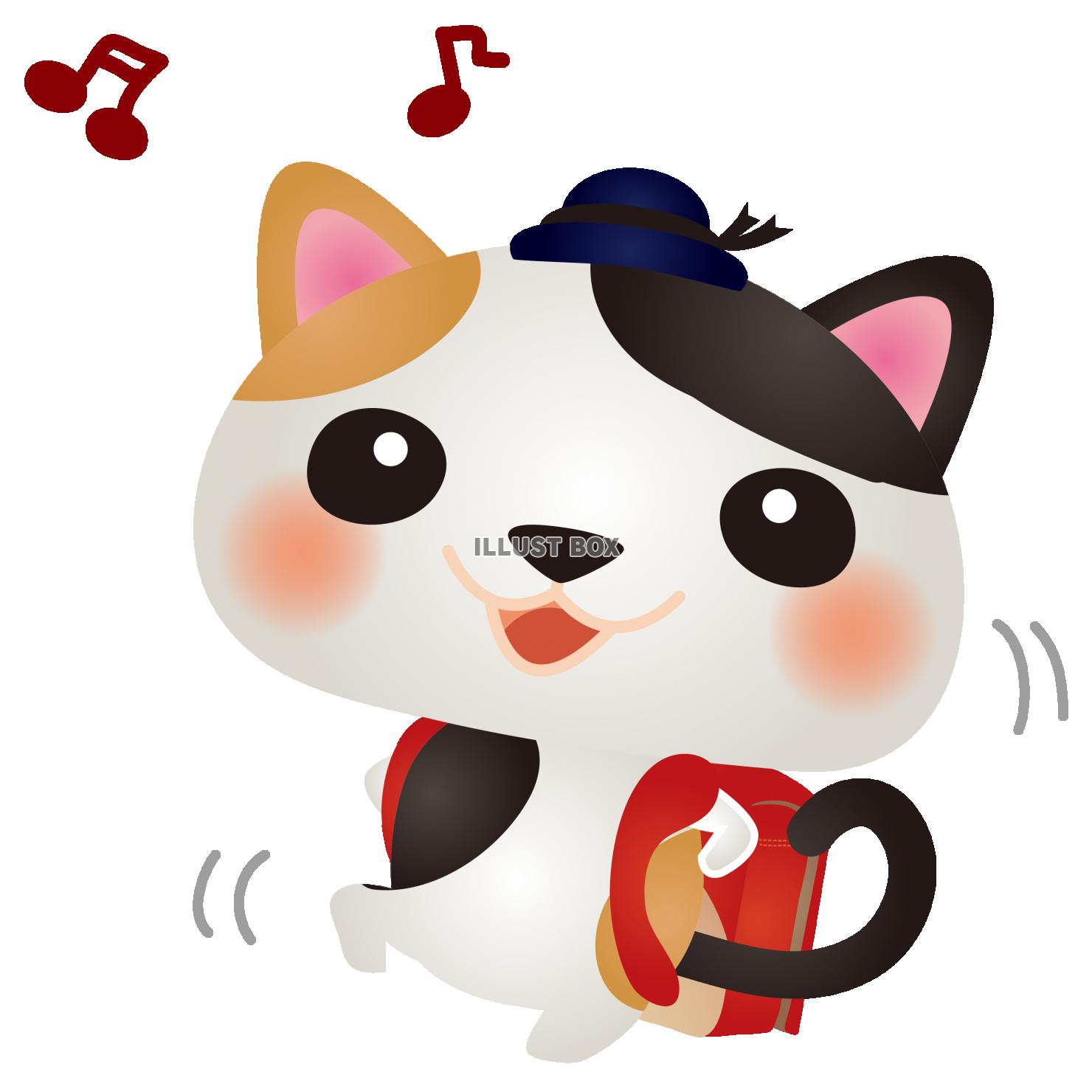 赤いランドセルをしょった三毛猫さんです。